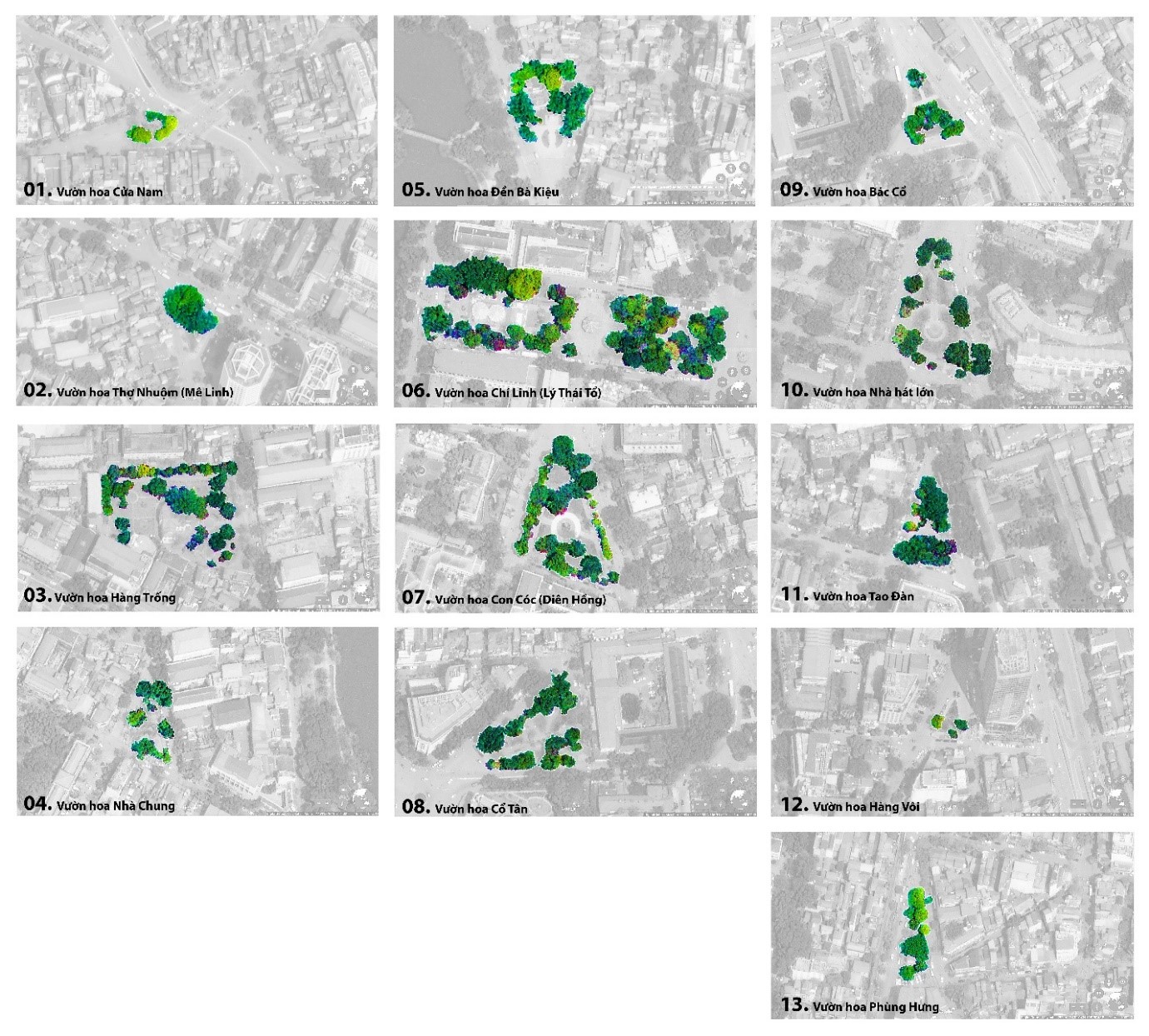 13 | Vườn hoa Phùng Hưng | 585 m2 / 1053 m2 | 56 % | 14 cây | ~ 80 % |