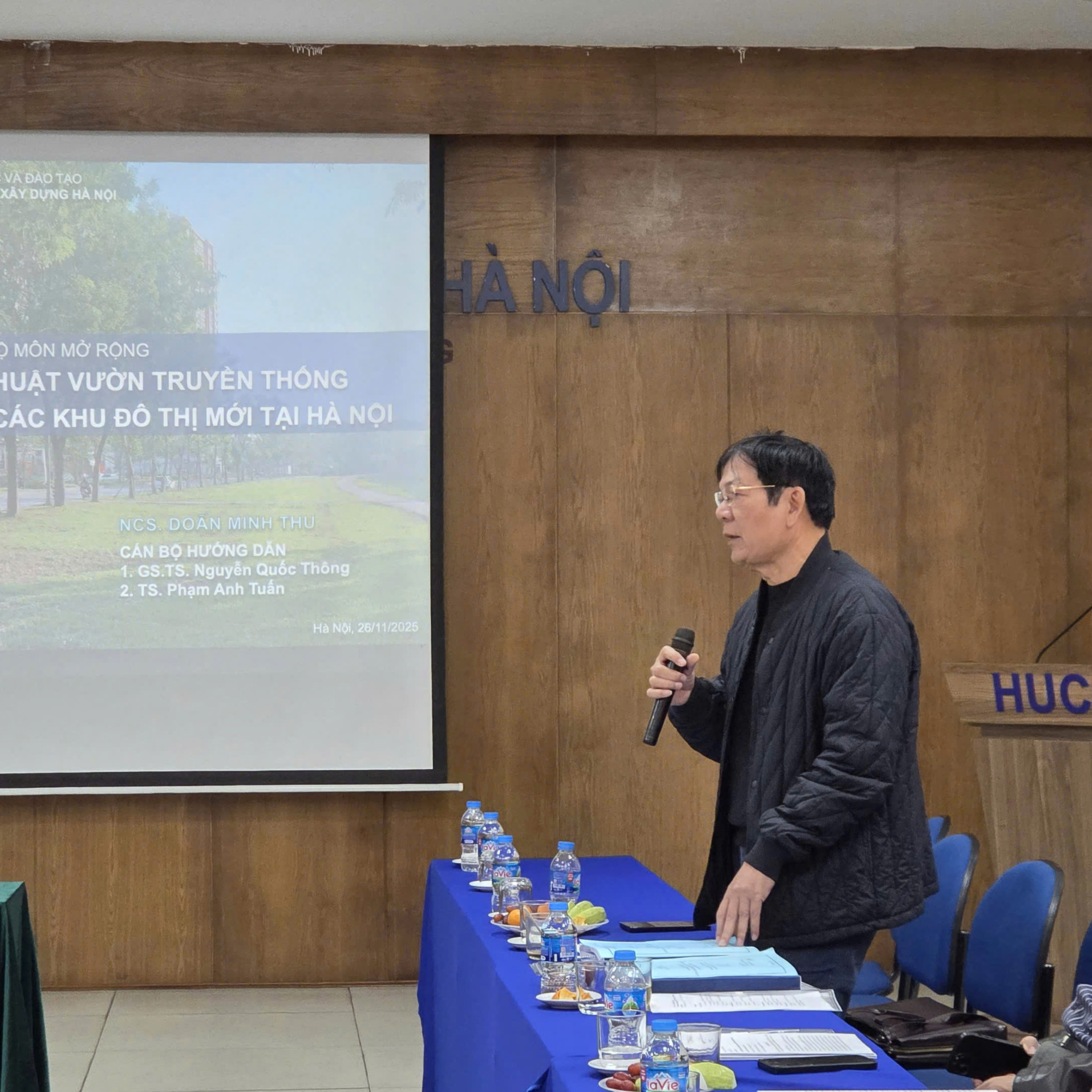 Ngày 26/11/2025 tại Trường Đại học Xây dựng Hà Nội, Nhóm Chuyên môn Lý thuyết và Lịch sử Kiến trúc đã tổ chức buổi Hội thảo mở rộng cho Nghiên cứu sinh (NCS) Doãn Minh Thu; Chuyên ngành: Kiến trúc; Mã số: 9580105; Đề tài: “Khai thác giá trị nghệ thuật vườn truyền thống trong tổ chức cảnh quan các khu đô thị mới tại Hà Nội”. Dưới sự hướng dẫn khoa học của GS.TS. Nguyễn Quốc Thông và TS. Phạm Anh Tuấn, NCS Doãn Minh Thu đã đạt được một số kết quả nghiên cứu nhất định và trình bày các nội dung chính của luận án trong buổi Hội thảo có sự góp mặt, tham gia phản biện của nhiều chuyên gia uy tín trong và ngoài Trường thuộc các lĩnh vực Quy hoạch, Kiến trúc, Cảnh quan đô thị.