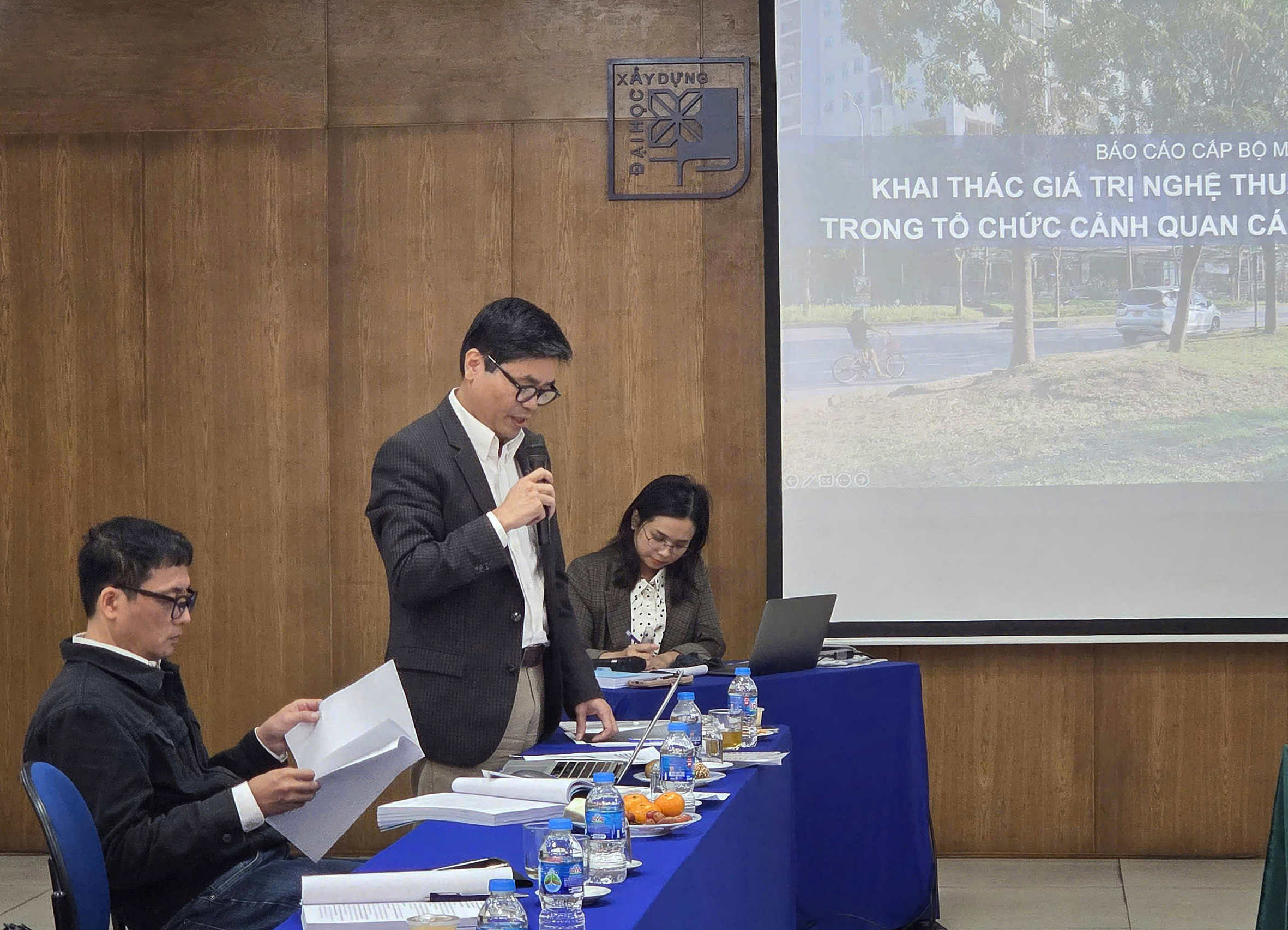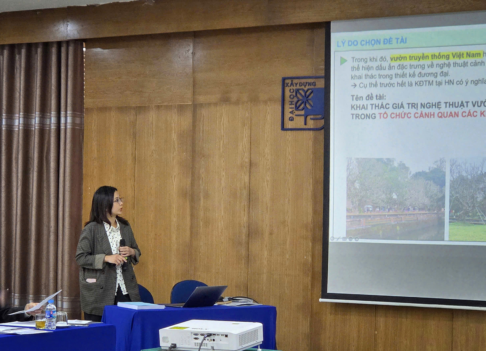 Nghiên cứu sinh Doãn Minh Thu báo cáo Hội thảo Mở rộng Luận án Tiến sĩ với tên đề tài: “Khai thác giá trị nghệ thuật vườn truyền thống trong tổ chức cảnh quan các khu đô thị mới tại Hà Nội”.