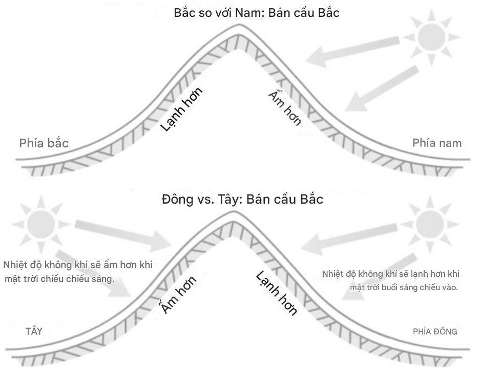 Hình 2: Ảnh hưởng của các yếu tố địa hình: hướng phơi, hướng dốc đến vi khí hậu cảnh quan. Nguồn: https://www.finegardening.com