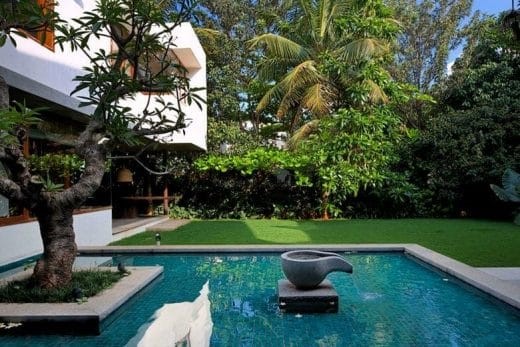 Hình 6: Sử dụng mặt nước và cây xanh chắn nắng để tạo môi trường vi khí hậu mát mẻ cho khu vườn nhiệt đới. Nguồn: https://www.thedecorjournalindia.com/